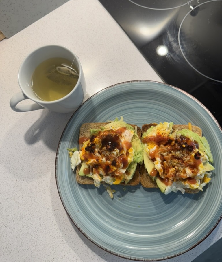 After showering and doing my morning routine, I have a quick brunch that I prepared. Here is my avocado toast with scrambled eggs and green tea. I usually like to do a mix of cooking at my dorm and getting food from outside.